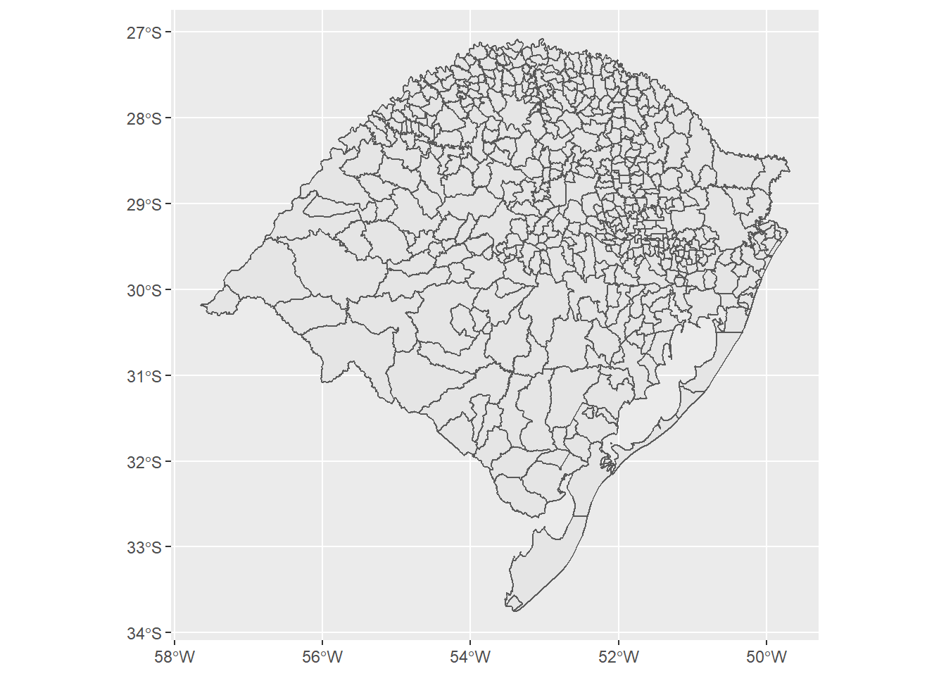 cities_RS <- read_municipality(code_muni = "RS", year= 2020)Ggplot of the cities