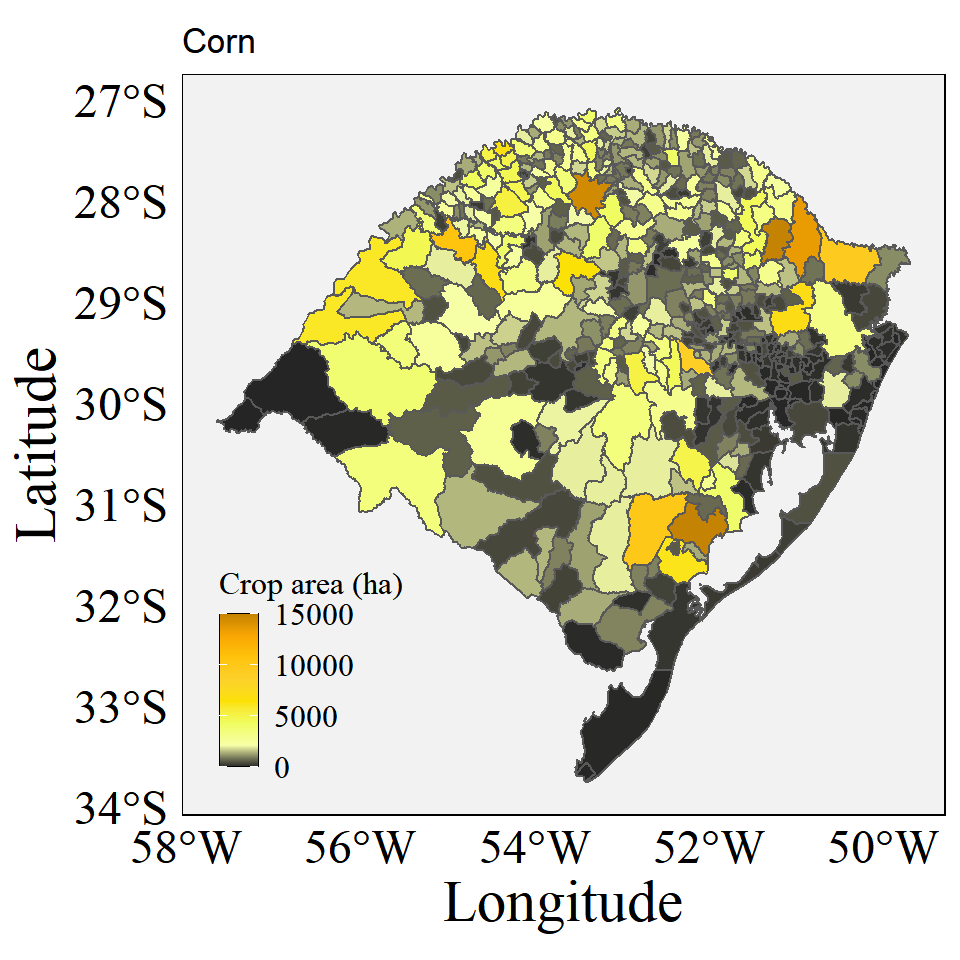 data <- data |> select(code,city,rice_crop,corn_crop,soybean_crop)Dataset of geobr package from municipalities of Rio Grande do Sul state